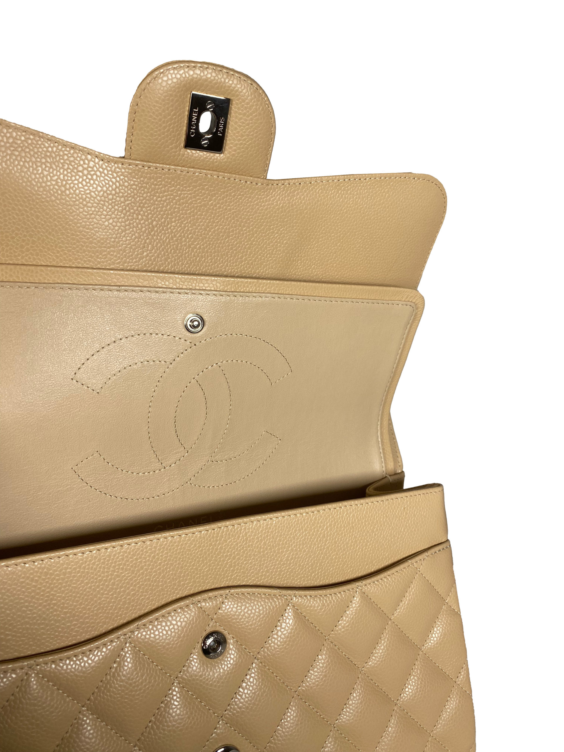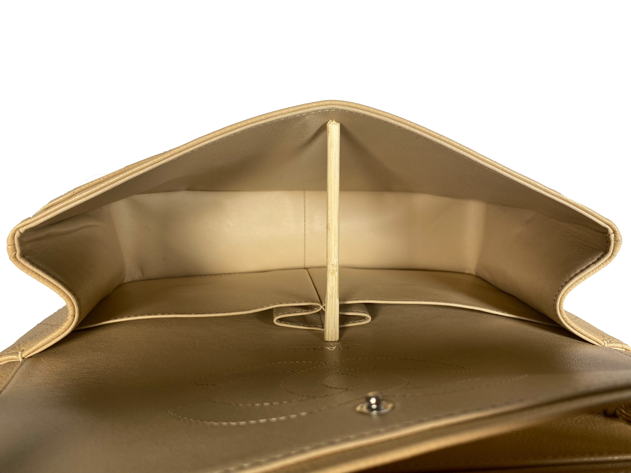 Die klassische Chanel Timeless kommt mit einer Double Flap und befindet sich im absolut neuwertigen Zustand. Sie ist perfekt für den Alltag aber auch für elegante Abende geeignet. Durch ihre wunderschöne beige Farbe passt sie perfekt zu jedem Outfit.
